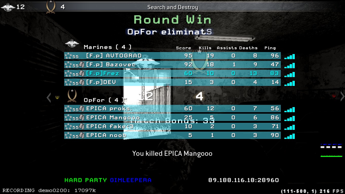 Противник: EPICA Счет: 2-1 Результат: Победа Карты: Удар Площадка Крушение, Приятно было сыграть с нормальным честным адекватным кланом спс парням за игру)